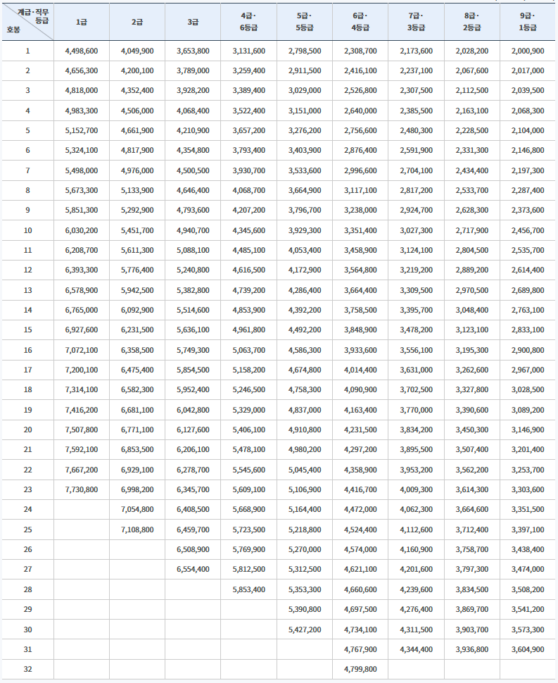 일반직 공무원에 대한 봉급표이며, 그 외 다른 직종의 공무원 봉급표는 아래 링크를 통해 확인할 수 있습니다.